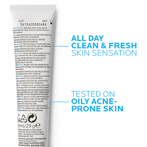 La Roche-Posay Effaclar K (+) Anti-Blackhead Moisturizer – 40ml is a high-performance, dermatologist-tested daily treatment specifically formulated for oily, blemish-prone skin. Designed to address the complex needs of adult skin prone to imperfections, this advanced moisturizer combines cutting-edge skincare technology with clinically proven ingredients to deliver comprehensive benefits. The formula incorporates Lipo-Hydroxy Acid (LHA), a derivative of salicylic acid, known for its gentle exfoliating properties that help to unclog pores, reduce blackheads, and improve skin texture. Additionally, the inclusion of Airlicium™, a patented ingredient, offers exceptional oil-absorbing capabilities, providing up to 8 hours of mattifying effect, making it ideal for those with oily skin seeking long-lasting shine control. The presence of Vitamin E and Carnosine adds antioxidant protection, shielding the skin from environmental stressors and preventing premature aging. The lightweight, non-comedogenic, and fragrance-free formulation ensures that it won’t clog pores or cause irritation, making it suitable for sensitive skin. Upon application, the skin feels instantly refreshed, with a noticeable reduction in excess shine and a smoother, more refined texture.