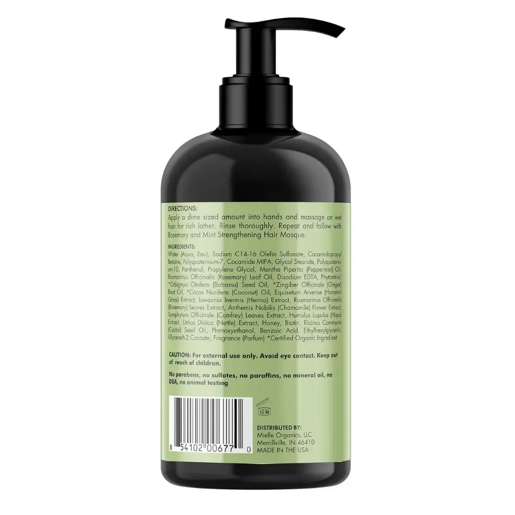 Water (Aqua, Eau), Sodium C14-16 Olefin Sulfonate, Cocamidopropyl Betaine, Polyquaternium-7, Cocamide MIPA, Glycol Stearate, Polyquaternium-10, Panthenol, Propylene Glycol, Mentha Piperita (Peppermint) Oil, Rosmarinus Officinalis (Rosemary) Leaf Oil, Disodium EDTA, Phytantriol, *Orbignya Oleifera (Babassu) Seed Oil, *Zingiber Officinale (Ginger) Root Oil, *Cocos Nucifera (Coconut) Oil, Equisetum Arvense (Horsetail Grass) Extract, Lawsonia Inermis (Henna) Extract, Rosmarinus Officinalis (Rosemary) Leaves Extract, Anthemis Nobilis (Chamomile) Flower Extract, Symphytum Officinale (Comfrey) Leaves Extract, Humulus Lupulus (Hops) Extract, Urtica Dioica (Nettle) Extract, Honey, Biotin, Ricinus Communis (Castor) Seed Oil, Phenoxyethanol, Benzoic Acid, Ethylhexylglycerin, Glycereth-2 Cocoate, Fragrance (Parfum) *Certified Organic Ingredient