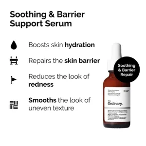 The Ordinary Soothing & Barrier Support Serum is a multi-active solution designed to repair and strengthen the skin barrier while soothing discomfort and reducing redness. Infused with a potent blend of 8 key technologies, including vitamin B12, ceramides, Centella Asiatica, and niacinamide, this serum provides an immediate 86% hydration boost to leave your skin smooth, hydrated, and radiant. Key ingredients like Bisabol and Gallic Acid Derivatives help calm irritation, while a sugar-based hydrator complex delivers all-day moisture. This serum is clinically tested to repair the skin barrier within two hours and reduce visible redness. Ideal for all skin types, including sensitive skin, it improves uneven texture and alleviates dryness-related discomfort. Perfect for use both morning and evening, the lightweight, emulsion-like formula integrates seamlessly into your skincare routine. Achieve healthier, more resilient skin with The Ordinary Soothing & Barrier Support Serum.